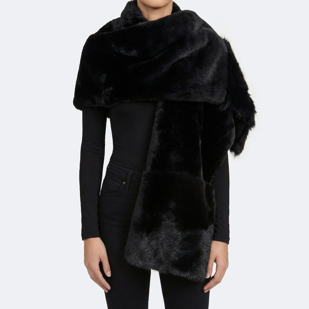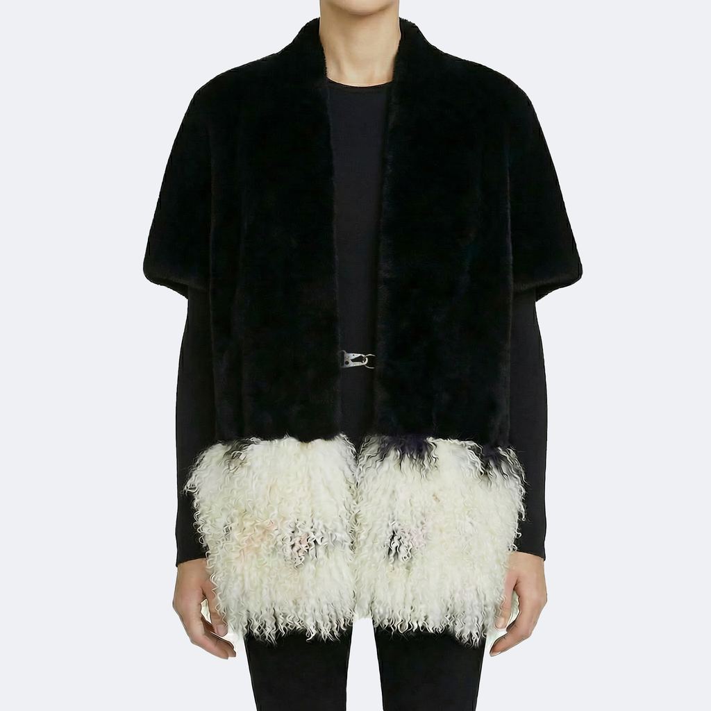The Solenne Shearling Cape can be worn draped as a luxurious scarf or fastened as a poncho-style cape using a lobster clasp at the neck or chest. Designed for warmth without sacrificing style, it features a hidden pocket and a fluid, sculptural drape.